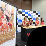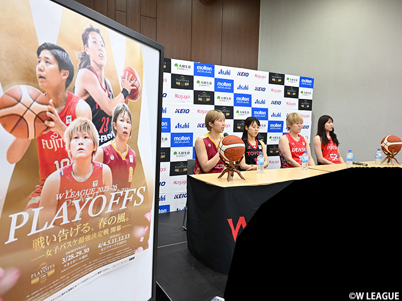 3月20日、「京王電鉄 presents Wリーグプレーオフ 2025-26」の記者会見が開催された。前日に帰国したばかりの女子日本代表選手がプレーオフ出場4チームからそれぞれ登壇し、レギュラーシーズン1位のトヨタ自動車アンテロープスの山本麻衣、2位のデンソーアイリスの髙田真希、3位の富士通レッドウェーブの宮澤夕貴、4位のトヨタ紡織サンシャインラビッツの東藤なな子が出席した。