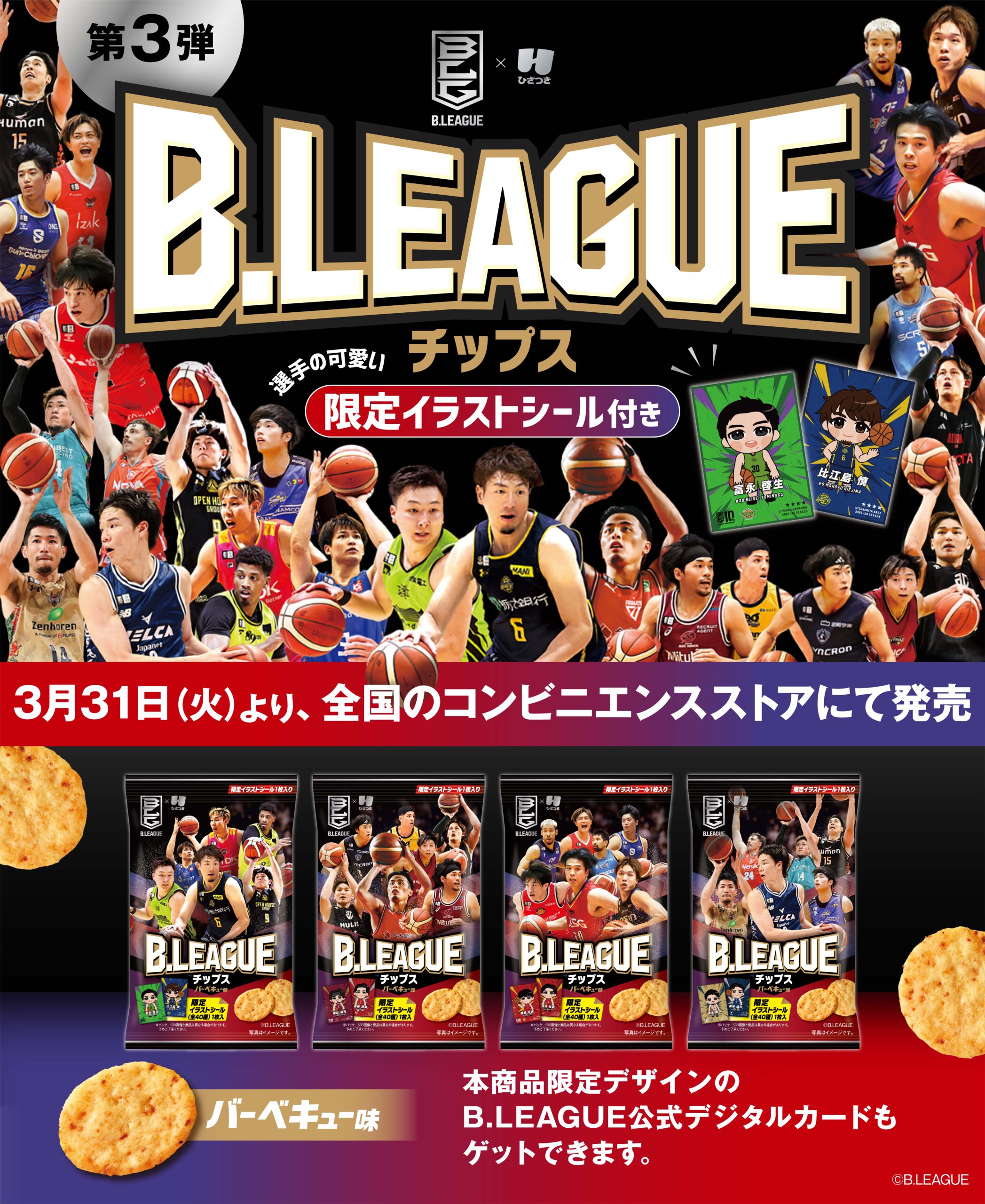 「B.LEAGUEチップス」第3弾が全国のコンビニで3月31日から販売開始…全40種の選手イラストシール付き