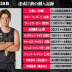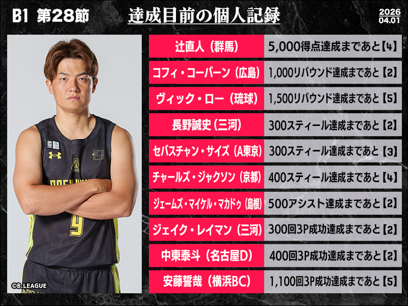 B1リーグ戦の第28節において達成が期待される個人記録をバスケットボールキング編集部がピックアップ。群馬クレインサンダーズの辻直人は5000得点の節目まであと4点と迫る。長年リーグを盛り上げてきたベテランが、ホームで節目達成を迎える瞬間に注目が集まる。横浜ビー・コルセアーズの安藤誓哉は、1100回3ポイントシュート成功まであと5本。今シーズン4試合で3ポイントシュート5本を沈めている名シューターにとっては、今節での達成も決して不可能ではない。琉球ゴールデンキングスのヴィック・ローは1500リバウンドが射程圏内に。今シーズン平均7.2リバウンドをマークしている大黒柱の大台突破にも期待したい。