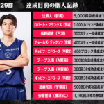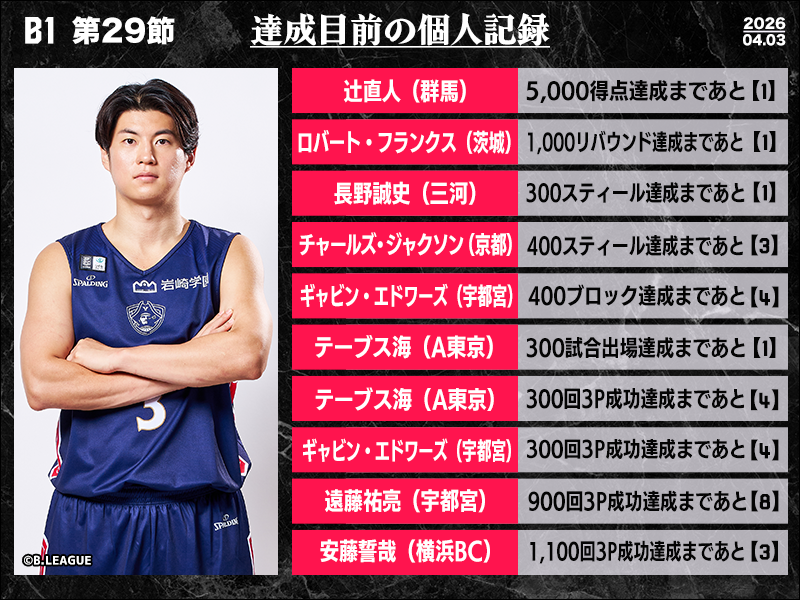 B1リーグ戦の第29節において達成が期待される個人記録をバスケットボールキング編集部がピックアップ。群馬クレインサンダーズの辻直人は前節3得点にとどまり、5000得点の節目に王手をかけて2連戦を迎える。アルバルク東京のテーブス海は、過去133人が達成した300試合出場と、97人が達成した300回3P成功が目前。苦境のチームを救う活躍で一気にダブル達成となるか。また、横浜ビー・コルセアーズの安藤誓哉は、1100回3Pシュート成功まであと3本として “神奈川ダービー“に臨む。富樫勇樹(千葉ジェッツ)に続く史上2人目となる大記録達成は秒読み段階だ。