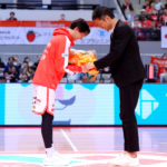 4月5日、『りそなグループ B.LEAGUE 2025-26 SEASON』B1第29節GAME2が開催。広島サンプラザホールで行われた千葉ジェッツと広島ドラゴンフライズの試合後に、今シーズン限りで現役を引退する千葉Jの西村文男へ、広島の朝山正悟ヘッドコーチから花束が贈られた。