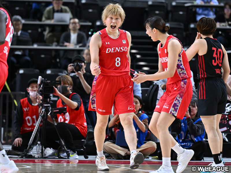 両チーム一歩も譲らず46-46の同点で迎えた勝負の第4クォーターは、オフェンスリバウンドを拾ったオコンクウォスーザンアマカが2連続得点を挙げトヨタ自動車が先行したが、対するデンソーは勝負どころで髙田が流れを手繰り寄せるショットを連発。大黒柱の活躍で勢いづいたデンソーは、6点リードで迎えた残り1分に木村亜美が値千金の3ポイントを決め、勢いそのままに突き放した。