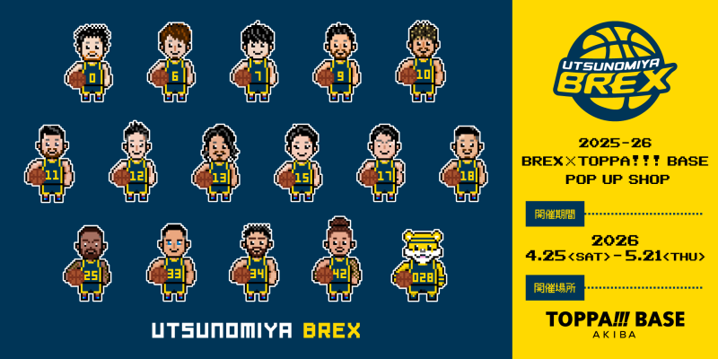 このコラボでは、宇都宮に所属する選手やチームマスコットのブレッキーをモチーフにしたドット絵の描き下ろしイラストを、アクリルスタンドやトートバッグ、Tシャツなどのオリジナルグッズに落とし込み販売する。グッズの一部はサテライトショップや「TOPPA!!! BASE AKIBA」の公式オンラインショップでも展開を予定している。