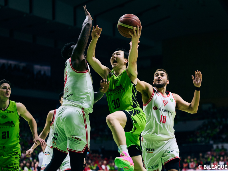 後半開始直後、北海道はドワイト・ラモスのフリースローをきっかけに7-0のランを炸裂させて同点に追いつく。その後は一進一退の攻防が続くなか、61-66とわずかにリードを許して最終クォーターへ。第4クォーターでは両者一歩も譲らぬシーソーゲームとなるが、北海道は富永啓生の連続得点で逆転に成功。このクォーターだけでチームで31得点を挙げる猛攻を見せると、92-84で鮮やかな逆転勝利を飾った。