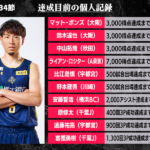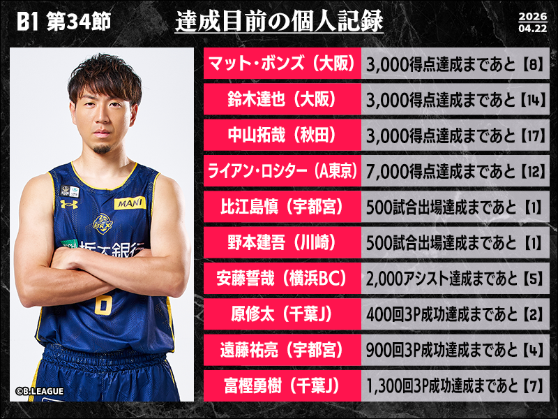 B1リーグ戦第34節で達成が期待される個人記録をバスケットボールキング編集部がピックアップ。今週末は関東で多数の記録達成の瞬間が見られそうだ。地区優勝マジックを3としている宇都宮ブレックスでは、比江島慎が500試合出場にリーチ。遠藤祐亮も史上9人目となる900回3ポイントシュート成功を射程圏内にとらえている。また、千葉ジェッツでは原修太の400回3ポイントシュート成功が目前に迫ってきた。このところはプレースタイルの変化もあり試投数が減少傾向にあるが、メモリアルな一撃でチームを勢いづけられるか。