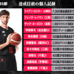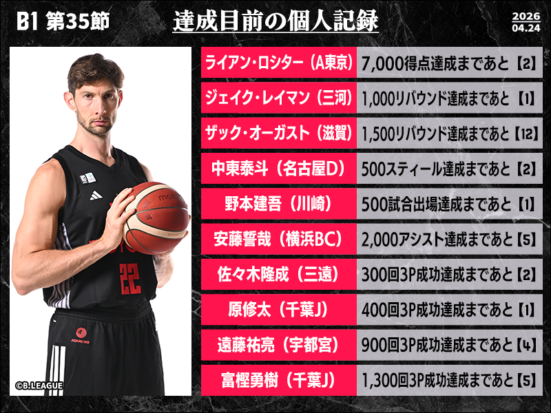 B1リーグ戦において達成が期待される個人の記録をバスケットボールキング編集部がピックアップ。千葉ジェッツの富樫勇樹があと5本でB1史上初となる1300回3Pシュート成功の大記録達成となる。また、アルバルク東京のライアン・ロシターが7000得点の大台まであと2に迫っているほか、名古屋ダイヤモンドドルフィンズの中東泰斗も500スティールまであと2としている。さらに、シーホース三河のジェイク・レイマンも1000リバウンドまであと1に迫っており、各クラブをけん引する主力の記録達成に注目したい。
