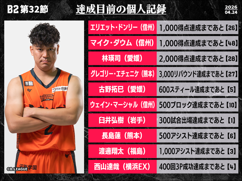 B2リーグ戦において達成が期待される個人の記録をバスケットボールキング編集部がピックアップ。今節はディフェンス面でチームを支える選手たちの記録に注目。信州ブレイブウォリアーズのゴール下を守るウェイン・マーシャルは、達成すればB2史上初となる500ブロックショットの大台まであと10に迫っている。また、愛媛オレンジバイキングスの古野拓巳も600スティール達成まであと5としており、守備職人たちが打ち立てる偉大な金字塔の瞬間を見届けたい。