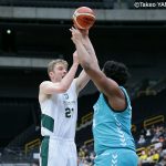 第1クォーター、京都は伊藤達哉が積極的に攻め込み9得点を挙げると、計25点を積みあげて9点リードを奪う。すると、次の10分間ではローレンス・ブラックレッジが10得点、内海慎吾が3本中3本の3ポイントを沈め9得点と攻撃をけん引。第1クォーターを上回る一挙33得点の猛攻を展開。守っては相手を13点に抑え、58-29でハームタイムを迎えた。