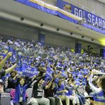 「FLY AGAIN」がかかるとウィングアリーナ刈谷が青く染まる[写真]=B.LEAGUE