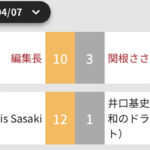 もう1つのマッチアップ、関根ささらさんと入江編集長のマッチアップは意外というべきか、10−3の大差で決着。その要因と言えるのが、関根さんがエースとして獲得した藤井祐眞が属する川崎ブレイブサンダースとペリン・ビュフォードの島根スサノオマジック戦が中止になったこと。さらに千葉ジェッツ対琉球ゴールデンキングスも中止となり、富樫勇樹(千葉)、ドウェイン・エバンス、岸本隆一(ともに琉球)がスタッツを挙げられなかったのは痛かった。