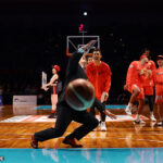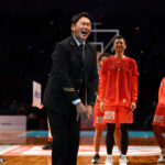 広島ドラゴンフライズは今月、ホームで行われる全6試合を「カープコラボ月間」として開催。初戦だった6日のB1リーグ第10節・京都ハンナリーズ戦には、新井監督が登場し、試合前のコート上で「同じ広島にあるスポーツチームとして、ドラゴンフライズのみなさまと一緒に励まし合い、支え合い、広島に元気を与えていきたいと思います」と挨拶した。