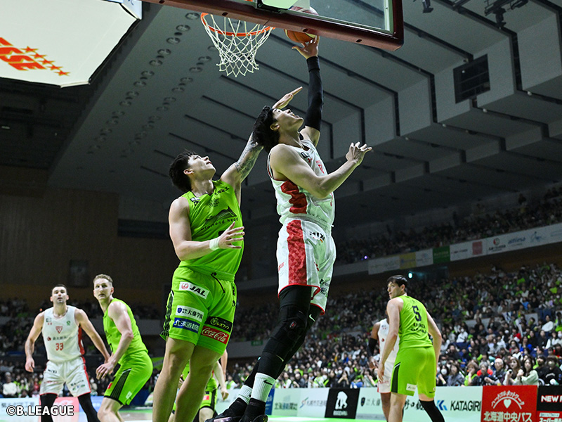 一方、最終クォーターでの失速が響いた北海道は、トーマス・ウェルシュが14得点11リバウンド、ライアン・クリーナーが13得点10リバウンド4アシスト、寺園脩斗が12得点4アシストを記録。順調な試合運びを見せていたものの、第4クォーターでは30失点に対し11得点となった。