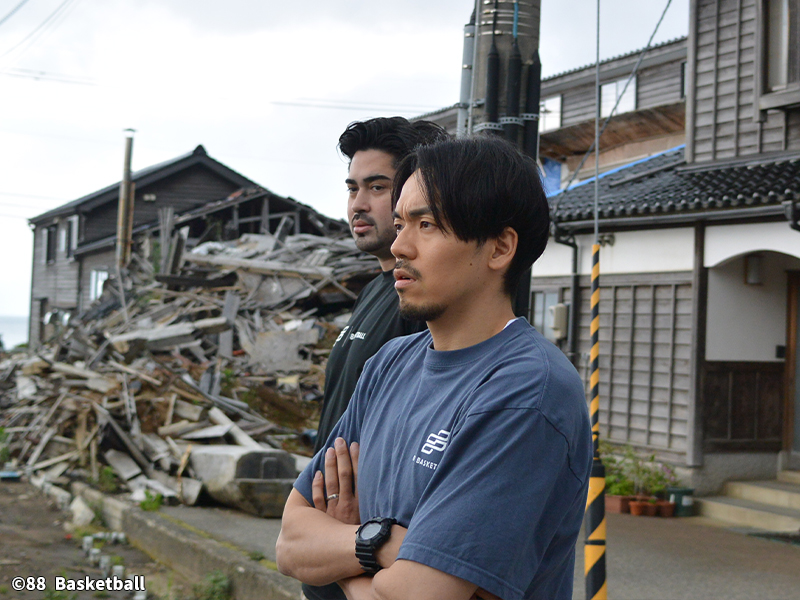 イベント前日の6月27日には、地元の3人制プロバスケットボールチーム「ECHAKE‑NA NOTO」の池田智美らと共に被災地を視察。輪島朝市跡地では火災により大規模な更地が広がる様子に驚き、白米千枚田では復旧が進むエリアと大規模崩落により未だ復旧できていないエリアとのコントラストに胸を痛めた。