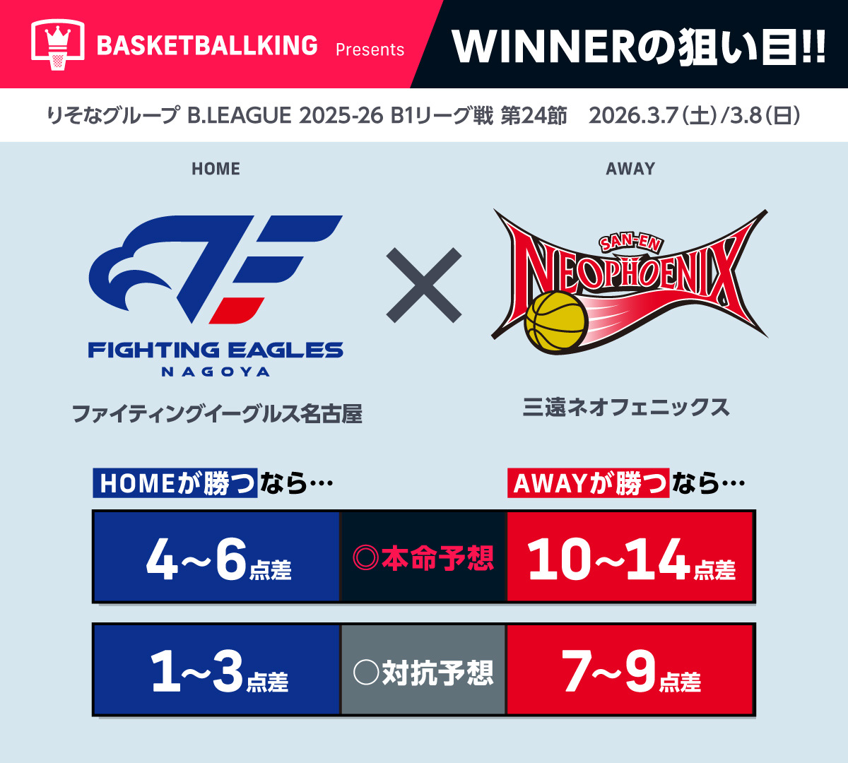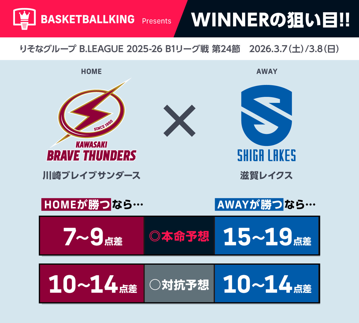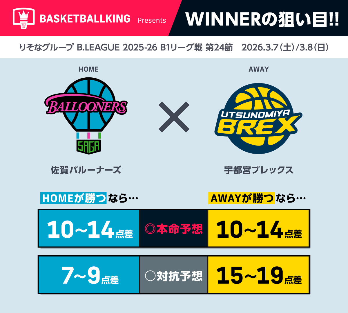 りそなグループ B.LEAGUE 2025-26シーズンもスポーツくじ『WINNER』が販売中だ。本記事ではバスケットボールキング編集部がB.LEAGUE注目カードの試合結果を予想! 参考にしていただくも良し、アナタだけの独自予想で当せんを狙うも良し。スポーツくじ『WINNER』でB.LEAGUEをさらにハラハラ、ドキドキしながら楽しもう!