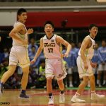 第2クォーターに入ると、1年生ながらスターティングポイントガードを務める黒川虎徹とエースキラーの北村をベンチに下げて温存し、チーム全体で難敵の攻略に臨む。しかし、吉田崇紘に連続得点を許すなど、15-22と点差を縮められ、トータルスコア45-41の4点差で前半を終了した。