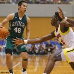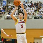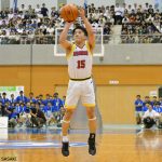 続く第2クォーター、ベンチメンバー中心の福岡第一に対し、北陸は土家拓大(2年)を起点に攻撃を組み立て相手についていく。残り3分26秒には、髙橋颯太(3年)のタフショットが決まって1ケタ点差に。しかし、福岡第一の山田真史(3年)がこのクォーターだけで4本の3ポイントをマークし、前半終了時点でのスコアは51-32となった。