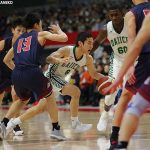 福岡第一は、後半開始早々からスティーブが連続得点をマーク。福大大濠はたまらずタイムアウトを取って試合を止める。すると、流れは徐々に福大大濠へ傾き、木林優(3年)、平松克樹(2年)らの得点で差を詰める。第3クォーター残り33秒からは速い展開から連続7得点を記録し、59-48で最後の10分間を迎えた。