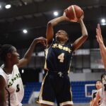試合が始まると、イゾジェ ウチェのゴール下を中心に得点を重ねていく京都精華学園。22-19で迎えた第2クォーター、明星学園の好守備でなかなか点差を離せない京都精華学園だったが、終盤にかけて徐々にリードをつかんでいき、46-36と10点を先行して試合を折り返す。