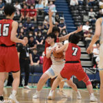 しかし、東海大福岡は慌てなかった。オールコートのプレスからのゾーンディフェンスとマンツーマンディフェンスを状況に応じて繰り出して精華女子の得点を止めると、浜口(さ)のドライブや境さくら(3年)がスティールから速攻で対抗。前半を35−36の1点差で折り返した。