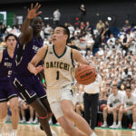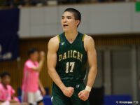 試合の行方が最後まで分からなかったのが延岡学園と福大大濠戦。第3クォーター終了時には54−42と延岡学園が12点ものリードを奪い優位に見えたが、福大大濠はともに岩下愛育(3年)と湧川裕斗、高田将吾(ともに2年)が積極的にアタック。守ってもゾーンプレスとマンツーマンのチェンジングディフェンスで延岡学園のターンオーバーを誘発させ、次第にビハインドを詰めていった。