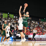 試合序盤は福岡第一の強度の高いディフェンスが光り、8-17と9点ビハインドで最初の10分間が終了。第2クォーターは東山が反撃を開始し、3ポイントやフリースロー、セカンドチャンスからの得点で追走する。ハーフタイム時点で25-29と4点まで点差を詰めて後半へ。