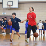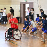 体育館で行われたバスケ体験会では、選手たちのリードのもと、ドリブルやシュートなどバスケの基本動作を用いたゲームで交流。バスケ経験・未経験は関係なく、性別も関係なく“バスケは誰でも楽しめるスポーツ”ということをテーマに楽しんだ。選手たちが繰り出した華麗なデモンストレーションも生徒たちを沸かせた。