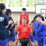 この日の先生役は、千葉ジェッツ・渡邊雄太、3x3女子日本代表・桂葵、車いすバスケットボール男子日本代表の鳥海連志と古澤拓也の4選手。競技のカテゴリや障がいの有無といった垣根を越えた選手たちが集結し、同校の中学3年生約145名にエールを送った。