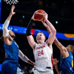 ジョシュ・ホーキンソン(サンロッカーズ渋谷)は渡邊雄太(フェニックス・サンズ)とともに40分間プレーし続け、29得点7リバウンド4アシスト1スティール4ブロックの大活躍。サイズで劣る日本のインサイドを支えた。