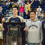 ジョージ・ワシントン大のシニアデーで渡邊の両親と写真に納まるジョゼフコーチ(右) [写真]=Getty Images