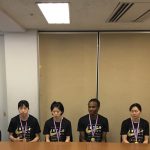 試合後行われた東京医療保健大学の記者会見の模様。恩塚亨監督(左)が笑顔を見せた