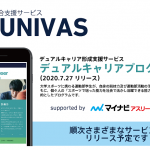 「My UNIVAS」は第一弾のサービスとして、「マイナビアスリートキャリア」と共同開発したデュアルキャリア形成支援サービスを提供する。同サービスは 「オンラインセミナー」、「キャリア適性診断」、「キャリア相談」を通して、大学スポーツに携わる運動部学生が、自身の競技力及び運動部活動の活性化・チーム力向上とともに、個々人の「スポーツで培った能力を社会で活かし活躍できる能力」向上させることを目的としている。