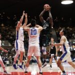 試合終了残り5分53秒、ブラ グロリダ(4年)がインサイドでファウルを受けながらもシュートを沈め48-52。次の攻撃でも角田太輝(4年)のアシストにグロリダが合わせて2点差とし、松下裕汰(4年)も冷静にジャンプシュートを射抜いて一気に同点に追いついた。