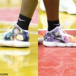 その馬瓜だが、プレーだけでなく目を引くのは足元。左足のシューズには人気漫画『ONE PIECE』の主人公、モンキー・D・ルフィーが、右足にはロロノア・ゾロが描かれているのだ。これは、アニメのキャラクターを描いたシューズを着用することがNBA選手の間でも流行っていることに触発されて。今回のイラストは、桜花学園高校時代の後輩に描いてもらったそうだ。
