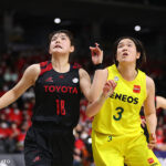 第3戦ではチーム最長となる48分6秒のプレータイムを記録し、要所での長距離砲やゴール下の強さを披露したENEOSの長岡萌映子。6得点10リバウンド3アシストを挙げたパワーフォワードは、試合後の記者会見で「古巣ということもあって、2連覇しているトヨタに対して、勝つことができて良かったと思います」と振り返っている。