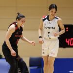 続く第2クォーターでも一進一退の展開が続くが、終盤にU25が試合の流れをつかむ。横山智那美(トヨタ自動車)が3ポイントを沈めると、前半だけで18得点を挙げたウチェも3ポイントを決め、男子日本代表・比江島慎(宇都宮ブレックス)のセレブレーションを披露。42-51とU25がリードを広げて試合を折り返した。