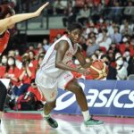 続く第2クォーター、富士通は開始から中村優花が得点を挙げると、赤木里帆の3ポイント、林のスティールからの速攻で相手を突き放す。一方、オフェンスが停滞したデンソーだが、髙田が得点を奪うと、渡部友里奈と馬瓜の長距離砲が立て続けにヒット。それでも、富士通は宮澤の3ポイントに加え、赤木や内尾も得点を伸ばし、45-36と点差を広げて試合を折り返した。