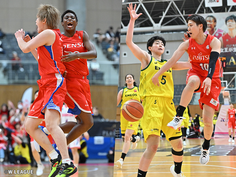 勝利を喜ぶデンソーの髙田とエブリン(左)/パスを放つ富士通の町田[写真]=Wリーグ