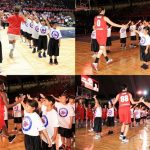 そして18時30分、最初の“仕事”がやって来た。コートに足を踏み入れると、カナダ、日本の順で選手が入場。子どもたちは、勢いよく走ってくる大柄な選手に対し、手を高く上げてお出迎え。約3分間とあっという間の時間であったが、子どもたちは選手一人ひとりとハイタッチを交わし、コート上で両チームとの記念撮影を行った。