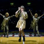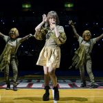 きゃりーぱみゅぱみゅがサプライズゲストとして登場。会場では驚きの歓声と拍手で本日一番の盛り上がりを迎えた。会場内の暗転とともに、バスケットコート上にはフロアプロジェクションマッピングの演出で、映画のモチーフである空中都市「旧東京」が登場。バスケットコートのセンターで、ダンサー4名を引き連れた