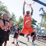 その時、ビッグフェラ役のシャック(シャキール・オニール、元ロサンゼルス・レイカーズほか)が審査員の1人を務めていたのですが、“高難度ダンクで、なおかつ一発で決めなければ満点を出さない判定”で、観る者全員を驚かせたのです。近くで観戦していた名俳優やファンがブーイングする中でも、「この判定基準は曲げない」という感じで、全然折れなくて(笑)。しかし、彼のその厳しい判定が生んだ緊張感が、2人の未知の能力を解放したのです。ゴードンは2012年のロンドンオリンピックの走り高跳びの銅メダリストの記録を超える高さでマスコットを跳び超えてダンク。ラビーンは史上初のフリースローラインからのレッグスルーダンクを決めてしまったのです。