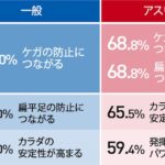 「一般スポーツ実施者(以下、一般)」と「アスリート」に対し、スポーツのパフォーマンスに「足裏のトレーニング」が影響を及ぼすことの認知を伺うと、一般が52.8%に対し、アスリートは75.0%という結果に。また、足裏トレーニングが及ぼす具体的なメリットを問うと、両者共に、ケガや偏平足の防止につながるトレーニングであるという理解が上位に。障害の防止に繋がるという事に加え、アスリートでは「発揮できるパワーが大きくなる(59.4%)」という点もトップ3にランクインしました。