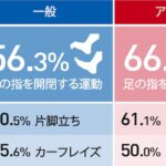 次に、一般とアスリートに対し「足裏トレーニング」の実施状況を問うと、一般は17.2%に対し、アスリートの半数以上(56.3%)が実施していることが分かりました。一般は、足裏トレーニングがパフォーマンスに及ぼす影響を半数以上が認知しつつも、多くはその実施には至っていない状況でした。足裏トレーニングを実施している一般(103名)とアスリート(18名)に、どのようなトレーニングを行っているか調査。両者ともに「足の指を開閉する運動」が第1位に。その他、「カーフレイズ(壁に手をつきながら、つま先立ちし、かかとを上下に動かす運動)」も両者上位にランクインする結果となりました。