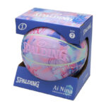 表はパステルカラーのロゴ、裏はイラストデザインを生かした無色のエンボスロゴといった表裏異なるデザインの合成皮革バスケットボール。専用BOX付き。