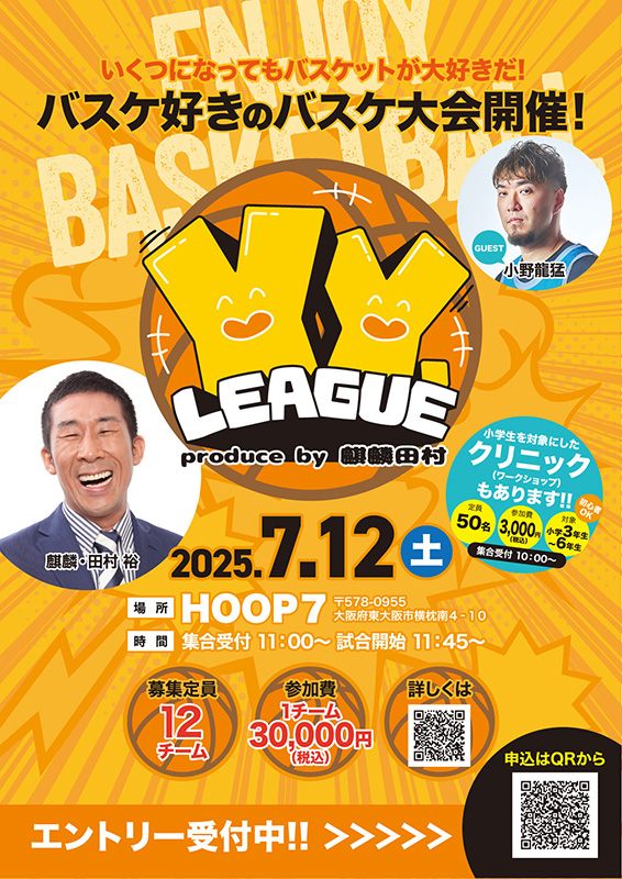 7月12日、大阪府東大阪市のバスケットボール施設「HOOP7」にて、『YY.LEAGUE ~produce by 麒麟田村~』が開催される。本イベントは、お笑いコンビ「麒麟」の田村裕氏が企画・監修を務める新感覚のスポーツイベントであり、年齢や性別を問わず誰もが楽しめるバスケットボール大会として注目を集めている。