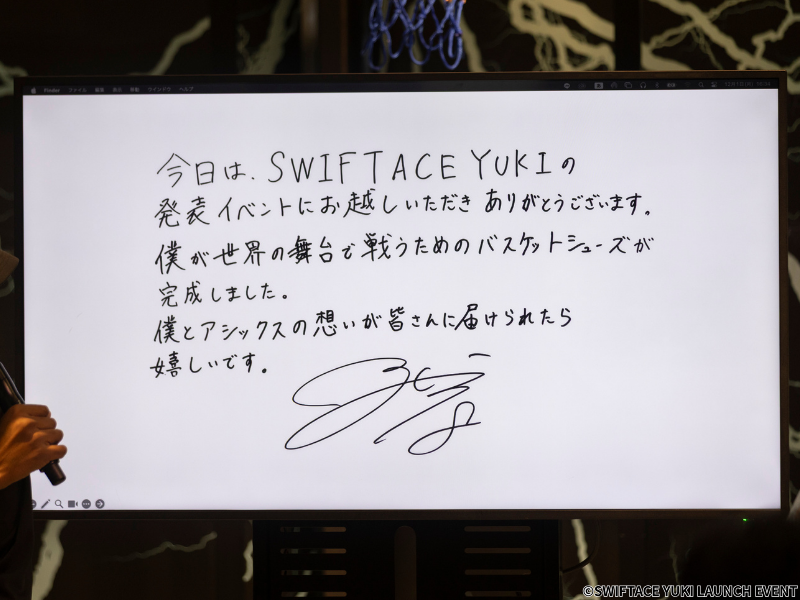 河村から寄せられた直筆メッセージ[写真]=SWIFTACE YUKI LAUNCH EVENT