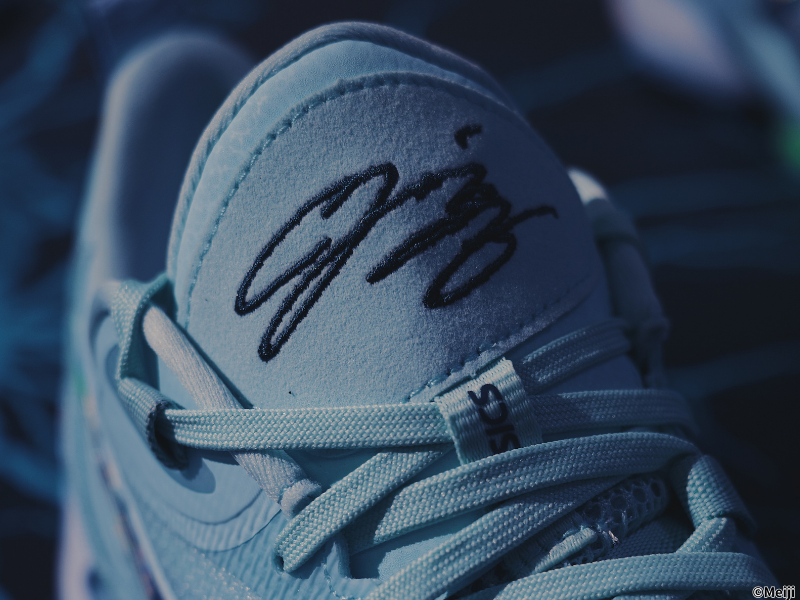 また、デザインも細部まで洗練されており、ボックストップにブランドロゴはなく、メタリックな河村のサインだけが輝く美しいラッピングに。シューズ本体についてはパリでランウェイを歩くUTA氏も「流れるようなデザイン。僕の知っている従来のアシックスのバスケットシューズではなく、海外のファッションシーンからも人気の高い『GEL-KAYANO』のようなムードを感じる」と絶賛した。
