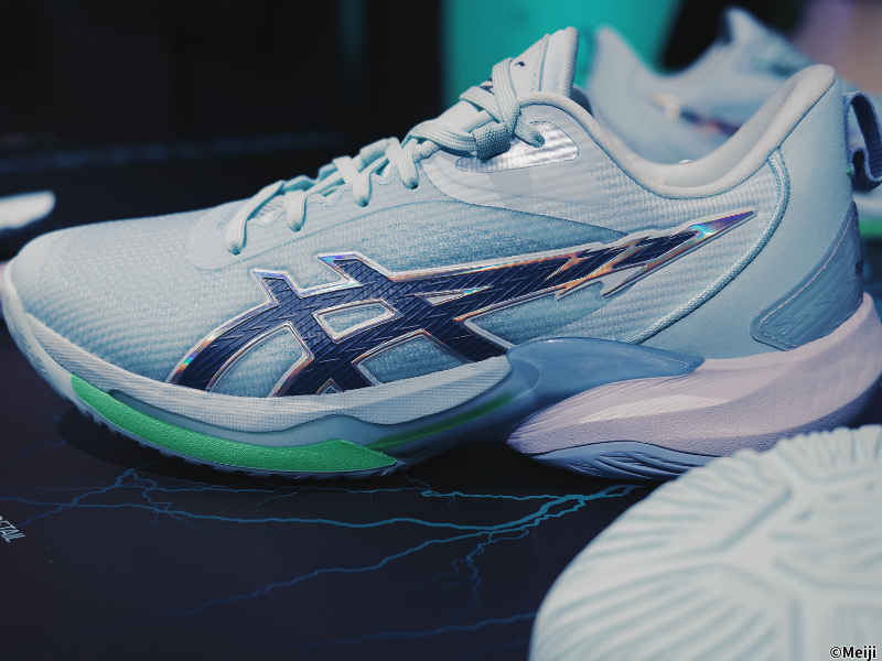 別のベクトルからのアプローチにも、会場からは感嘆の声が漏れた。マイクは松浦氏へと移り、デザインコンセプトの話題へ。「BLITZ」というキーワードに象徴されるように、アッパーのサイドを飾るアシックスストライプは、後部に稲妻がほとばしるアグレッシブなデザインが採用されている。さらに、このコンセプトはダブルミーニングになっている。日本では古来より「雷が多い年は豊作」というような言い伝えがあったことから、BLITZは“五穀豊穣をもたらす雷神”を表現。田畑への刺激で作物が育つ、すなわち河村の世界での活躍がバスケットボール界を刺激し、国内の土壌を耕すことで、次世代のスター誕生に貢献するという願いが込められているのだ。