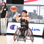 まずは、2メン、3メンで操作が難しい競技用車いすを自由自在に操りながらの華麗なパスさばきを披露。その後の3ポイントシュートでは緊張からか、なかなかネットを揺らすことはできなかった。それでもジャンプすることなく座った状態で、ランニングバスケと同じ距離から、同じ高さのゴールに向けてと軽々とシュートを放ち、鍛え抜かれた腕力をアピールした。