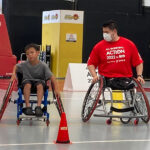 香西に見守られながら競技用車いすを操作する参加者