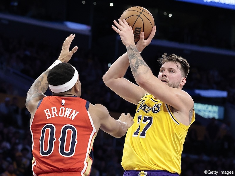 ドンチッチが試合序盤からオフェンスをけん引すると、第1クォーター開始3分26秒にレブロンの記念すべき得点となった3ポイントシュートをお膳立て。シェイク・ミルトン、ダルトン・コネクトも長距離砲を沈めるなど、第1クォーターで36-23とリードを奪った。